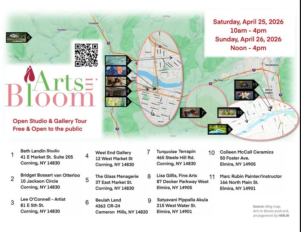 ![]() | Arts in Bloom: Open Studio & Gallery Tour 2026 Visit all 11 locations on this year's Arts in Bloom: Open Studio and Gallery Tour. This events spans Chemung and Steuben Counties and aims to highlight and celebrate the amazing artistic talent in our region! |