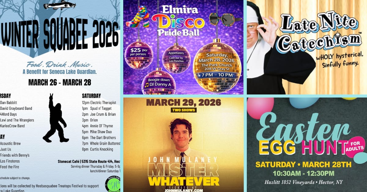 Highlights for March 27-29: March was in like a lamb and is going out with a party! Catch the beloved Winter Squabee at Stonecat Cafe, John Mulaney at the State Theatre, Catholic comedy at the Clemens Center, an adult Easter Egg hunt at Hazlitt, and a Disco Pride Ball in Elmira!