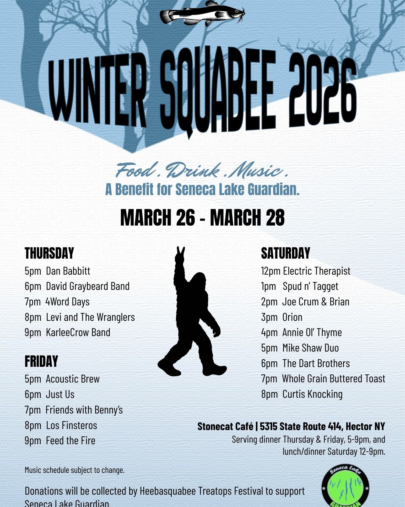![]() | Winter Squabee 2026 We're hoping to be celebrating the END of winter with our season opening and Wintersquabee, March 26-28! Check out this awesome line-up of local and regional bands, organized by Heebasquabee Treatops Festival. Musicians are giving their time and talent to support this benefit for @senecalakeguardian. We will be serving 5-9pm on Thursday & Friday, and 12-9pm on Saturday. Until then, stay warm friends! |